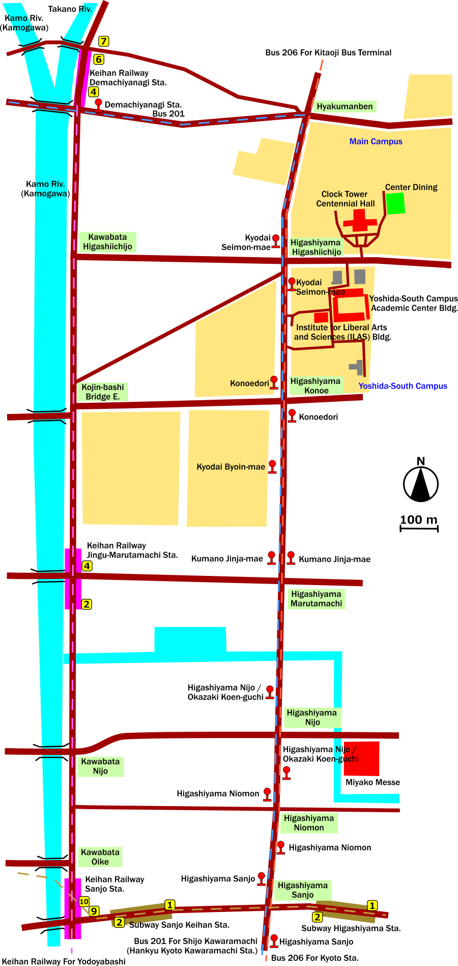 - Take the Subway and then transfer to the "201" Bus (via Gion) at "Imadegawa" Station. Get off at "Kyodai Seimon-mae" or "Konoedori" Stop. (About 10 min. on Subway and about 15 min. on Bus)
