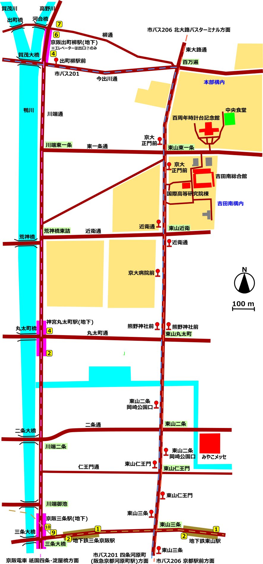 - 阪急「京都河原町駅」から京都市バス「201系統」(東山通経由祇園方面)に乗車、「近衛通」または「京大正門前」バス停下車。(バス乗車約20分)