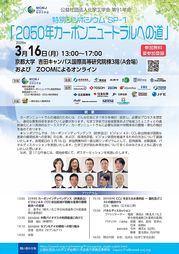 2020年3月以降、年会、秋季大会ごとに開催しております本シンポジウムですが、今回も、エネルギー・環境イノベーションとその社会実装について、会期前日の3月16日(月)午後、招待講演、依頼講演、パネルディスカッションを実施いたします。今回は、「カーボンインディペンデンス(炭素自立)ビジョン4.0:CO2排出削減が困難な産業の循環経済への変革」の公表、および、経済性評価、ビジョン実現を推進するための方法について議論したいと思います。